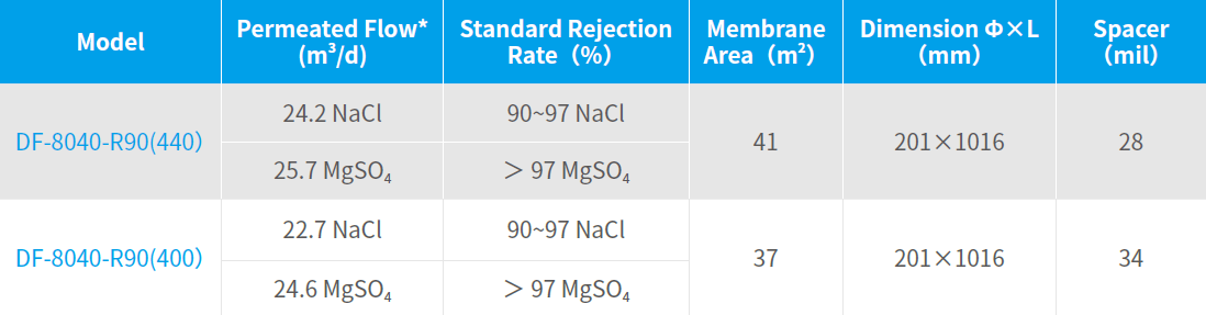 (2) Test conditions: 2,000 ppm NaCl or MgSO₄, 70 psi (0.48MPa), 25℃ , pH=7.5~8.0, recovery rate of 15%.