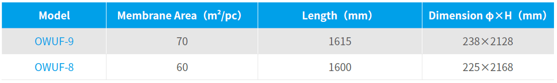 The OWUF (External Ultrafiltration Membrane Module), breaking through the design of polyvinylidene fluoride (PVDF) ultrafiltration super-hydrophilic modification and new detachable structure and eliminating membrane fouling in the application process of ultrafiltration membrane, is featured with higher sewage interception and larger filteration area. Thus, the system is ensured to run stably for a long term. It is one of major achievements of water projects during “the 12th Five-Year Plan”, and it has been awarded as the New Technology and New Product in Zhongguancun, the Beijing New Technology and New Product, etc. It has been successfully applied to China’s largest membrane seawater desalination project-Qingdao Dongjiakou Seawater Desalination Project (100,000t/d).