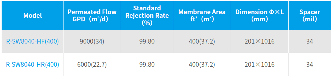 The SW(Seawater Desalination Reverse Osmosis Membrane Element), applicable to sea water and brackish water with high salt concentration, is featured with high compressive strength , low operation cost, high and stable desalination rate and so on. It has been awarded with the Major Environmental Protection Equipment Encouraged by the State and the China Patent Award.