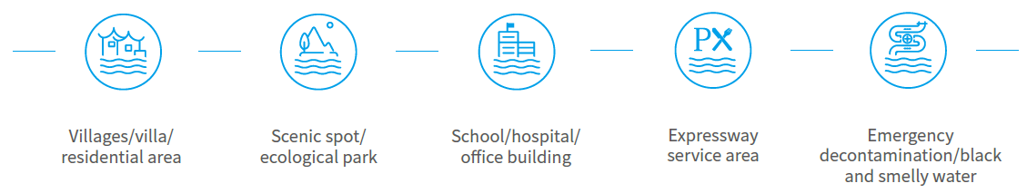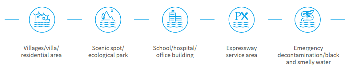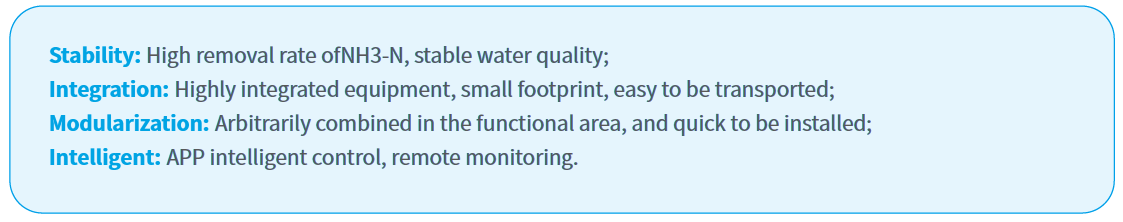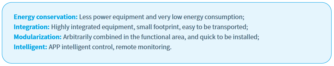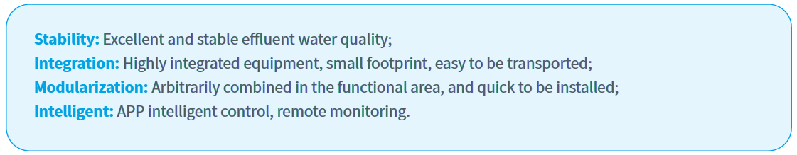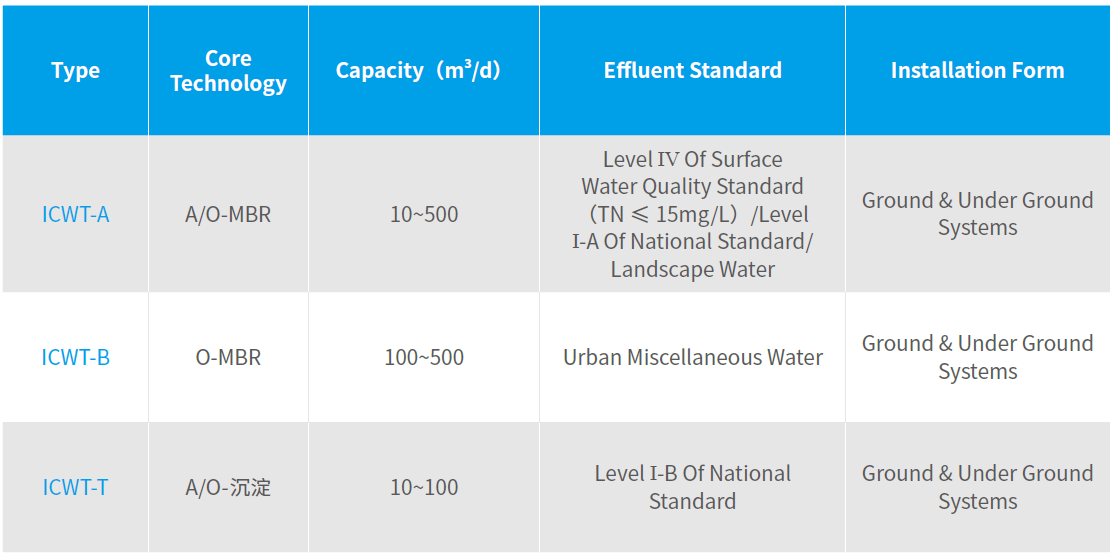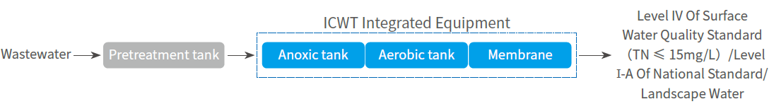 Type ICWT-A product is mainly used in the area with high requirements for effluent quality or sensitive to water environment and A/O-MBR process is adopted. The product is a fusion of two second prizes of National Science And Technology Progress Award, including “Membrane integrated wastewater deep purification technology”and“New technology of low energy consumption MBR wastewater recycling”. The main water quality indexes can meet Level IV (TN ≤ 15mg/L) of Environmental Quality Standard for Surface Water (GB3838-2002), Level I-A of Discharge Standard of Pollutants for Municipal Wastewater Treatment Plant (GB18918-2002) and the Reuse of Urban Recycling Water-Water Quality Standard for Scenic Environment Use (GB18921-2002).