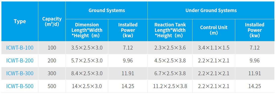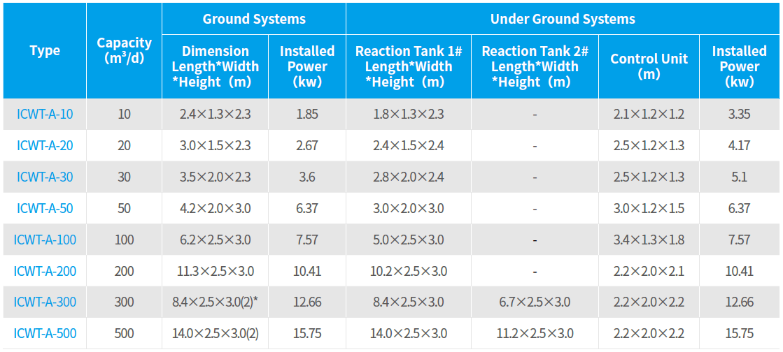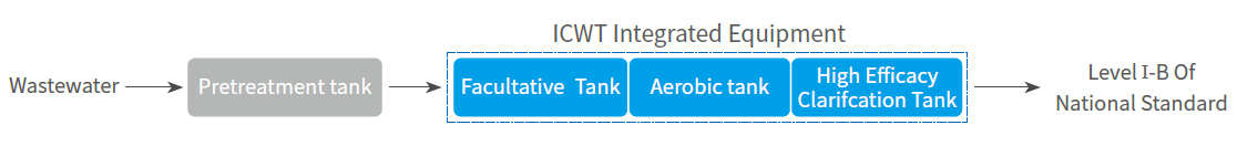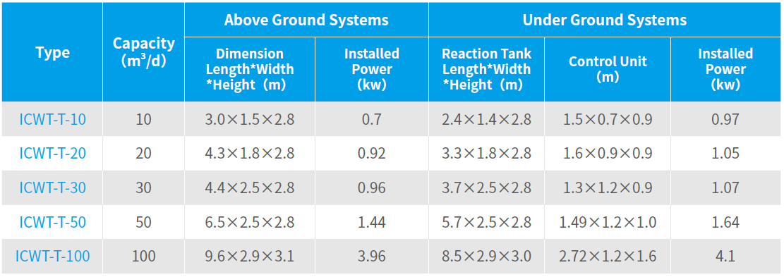 Type ICWT-T product is mainly used for low requirements for effluent quality and the traditional A/O + secondary sedimentation is adopted. The product is a fusion of advanced technologies, such as pulse aeration, air lift cycle, efficient clarification, etc. The effluent quality meets Level I-B of Discharge Standard of Pollutants for Municipal Wastewater Treatment Plan (GB18918-2002).