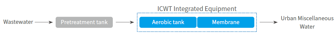 Type ICWT-B product is mainly used for higher effluent requirements for ammonia nitrogen and organic matters but no strict requirement of TN removal. Adopting O-MBR process, the product is to reach efficient removal of ammonia nitrogen and organic matters. The product is a fusion of two second prizes of National Science And Technology Progress Award, including “Membrane integrated wastewater deep purification technology” and “New technology of low energy consumption MBR wastewater recycling”. The effluent quality meets the water quality standard for urban sewage reuse and the Reuse of Urban Recycling Water-Water Quality Standard for Urban Miscellaneous Water Consumption (GB18920-2002).